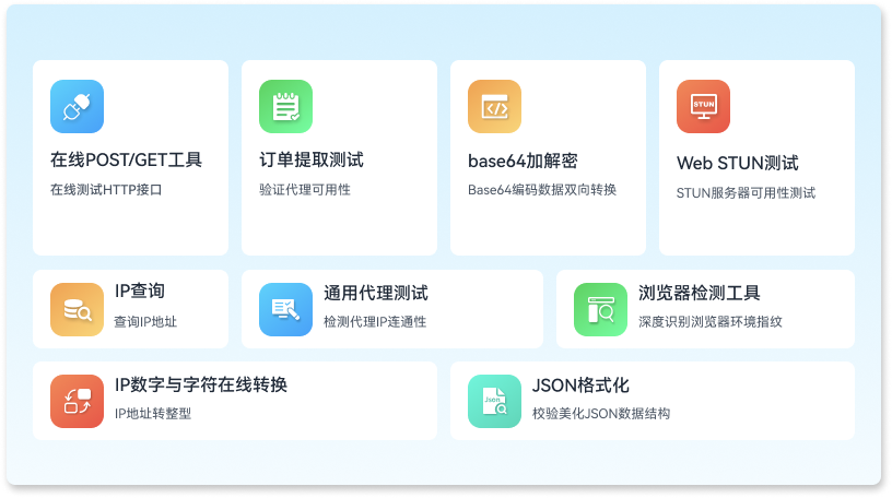 全新上线「工具箱」模块,专为解决客户的代理测试难题。包含一站式集成IP信息查询、通用代理测试、订单提取及WebRTC泄露检测等多种实用工具。旨在助您极速验证代理质量、精准定位网络问题,让代理的使用与管理更加高效便捷。立即体验,轻松提升工作效率!